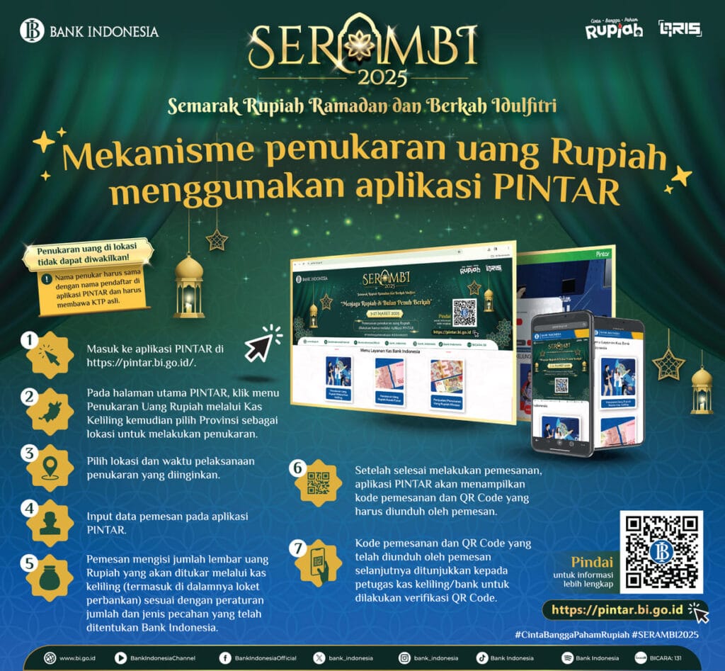 Seluruh rangkaian kegiatan penukaran uang pada momen Ramadan dan Idulfitri dikemas dalam kegiatan Semarak Rupiah Ramadan dan Berkah Idulfitri (SERAMBI) 2025 yang bertema “Menjaga Rupiah di Bulan Penuh Berkah”. Hal ini merupakan wujud komitmen Bank Indonesia (BI) untuk menjaga ketersediaan uang Rupiah di masyarakat selama Ramadan dan Idulfitri 2025.