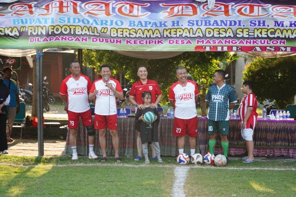 SIDOARJO | brigadepasopati.com – Bupati Sidoarjo, H. Subandi bersama Dandim 0816 Sidoarjo Letkol Inf. Dedyk Wahyu Widodo ikut fun football dengan Persaudaraan Kepala Desa Indonesia Kecamatan Sukodono.