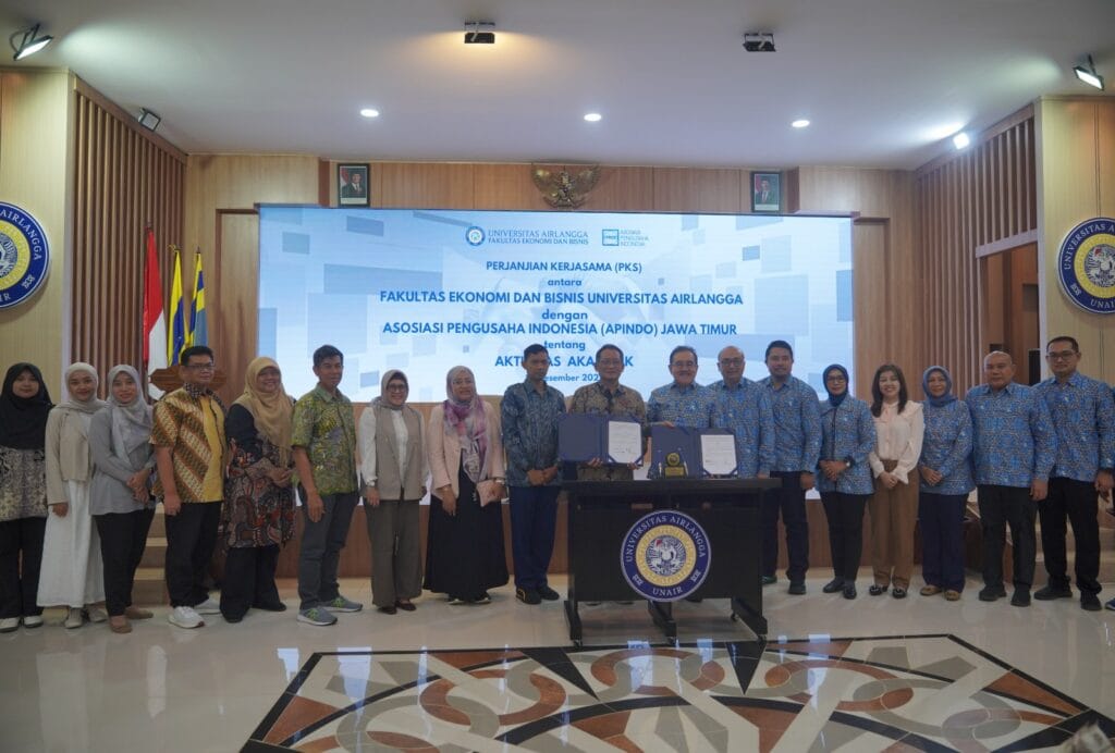 MoA ditandatangani oleh Dekan FEB UNAIR, Prof. Dr. Rudi Purwono, dan Ketua DPP APINDO Jawa Timur, Drs. Eddy Widjanarko, M.MT, dengan disaksikan jajaran pimpinan FEB UNAIR serta pengurus DPP APINDO Jawa Timur, pada Selasa (16/12/2025). Kerja sama ini membuka ruang kolaborasi yang lebih luas dan berkelanjutan antara dunia akademik dan pelaku usaha.