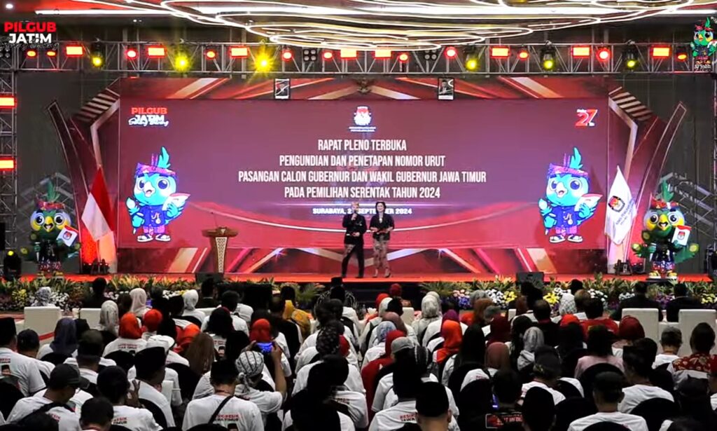 SURABAYA | brigadepasopati.com – Komisi Pemilihan Umum (KPU) Jawa Timur menetapkan nomor urut pasangan calon peserta Pilkada 2024 yakni Luluk Nur Hamidah-Lukmanul Khakim nomor urut 1, Khofifah Indar Parawansa-Emil Elestianto Dardak nomor urut 2 dan Tri Rismaharini-KH Zahrul Azhar Asumta atau Gus Hans nomor urut 3.